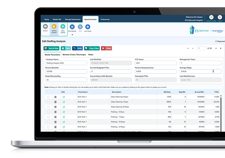- Run, analyze, and implement “What If?” scenarios to evaluate proposed changes to your cleaning program, such as budget restrictions or additional requirements on the EVS team.