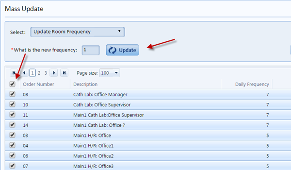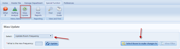 Now that are rooms are select­ed, we can update the new fre­quen­cy to 1, select All or a Sub­set of Rooms, and press UPDATE…