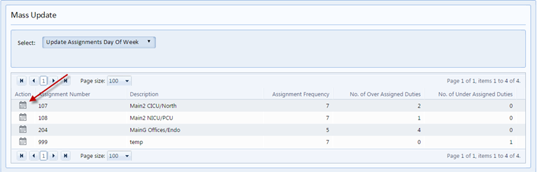 The next step is to update those assign­ments that we have reduced the office clean­ing. Choose “Update Assign­ments Day of Week” and the affect­ed assign­ments will be list­ed.  Now, click on the Cal­en­dar icon to make the prop­er adjust­ments…