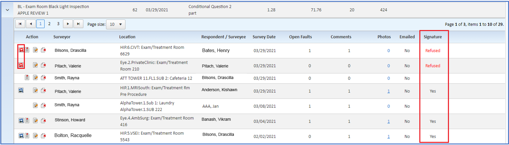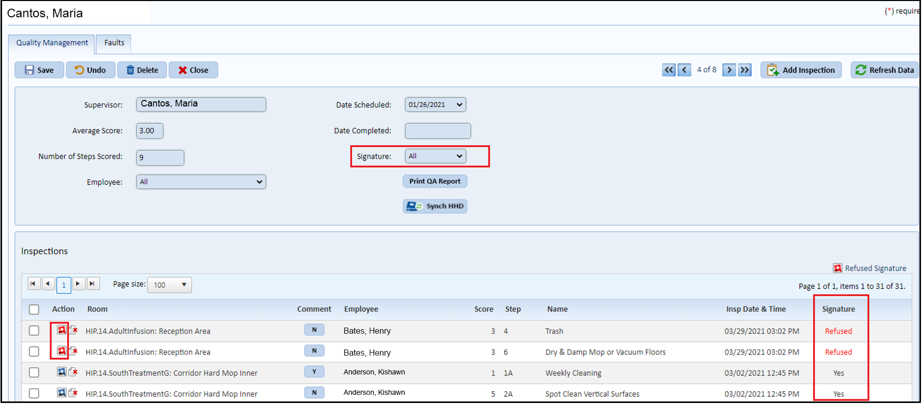 The “Refuse Signature” data will appear on the Inspection Detail page in the Quality Management Module. A new column entitled “Signature” has been added. “Refused” will be in red font when a survey has been marked “refuse signature” and the survey’s icon is red.