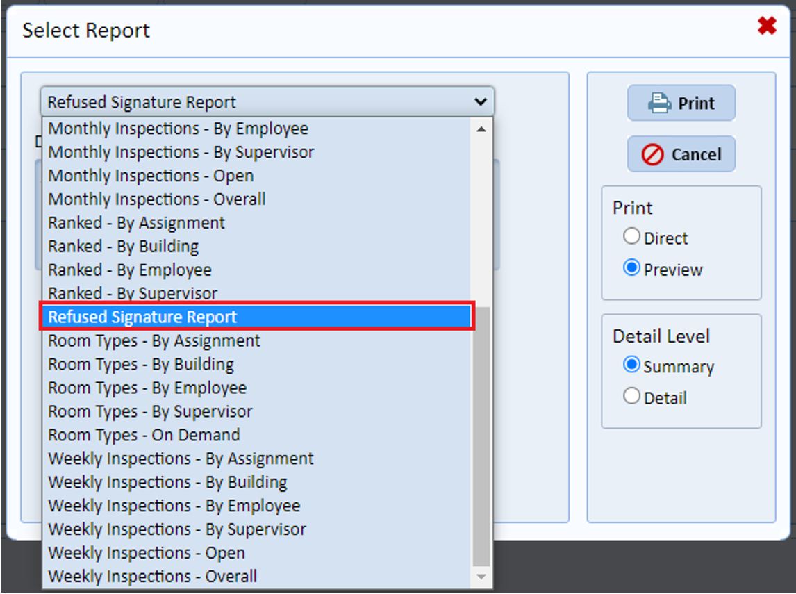 - Inspections and Surveys now have an option on the Signature Screen to select “Refuse Signature” when a signature can’t be obtained. This gives managers the ability to view and report inspections/surveys by their signature status.