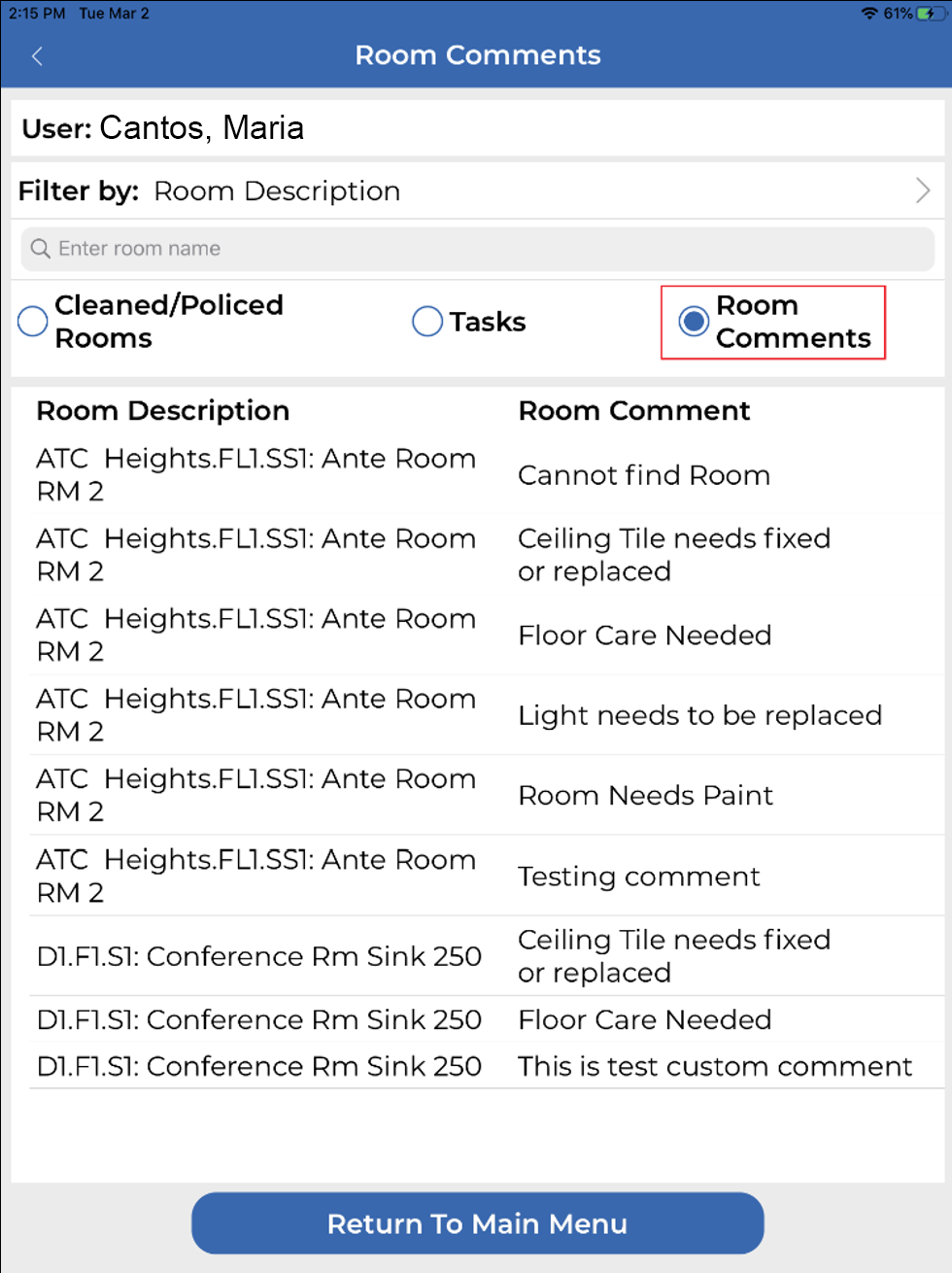 - Managers can now see Room Comments associated with cleaning tasks in Mobile Manager. This gives managers the ability to be aware of comments, resolve them, or create work orders right from their mobile device.