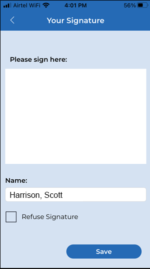 When a user taps the “Refuse Signature” checkbox, the Signature view will be disabled. The inspection can then be saved without a signature.